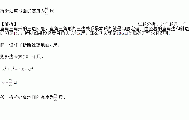 一根竹子高丈,折断后竹子顶端落在离竹子低端尺处,折断处离地面的高度是多少?(这是我国古代数学著作《九章算术》中的一个问题,其中的丈、尺是长度单位,丈尺).