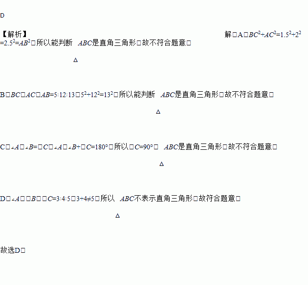 A. BC=1.5,AC=2,AB=2.5 B. BC∶AC∶AB=5∶12∶13