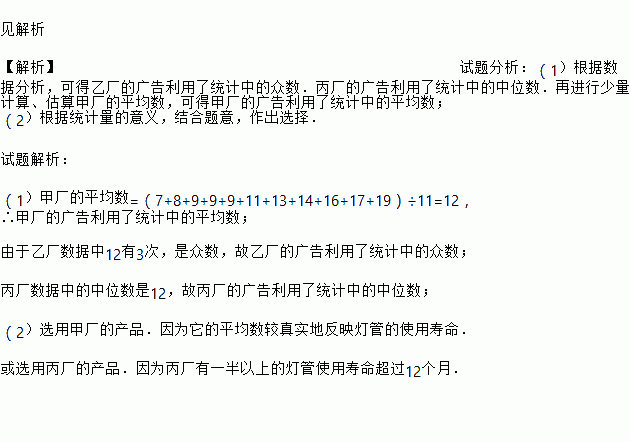 £¨1£©ÕâÈý¸ö³§¼ÒµÄ¹ã¸æ£¬·Ö±ðÀûÓÃÁËͳ¼ÆÖеÄÄÄÒ»¸öÌØÕ÷Êý£¨Æ½¾ùÊý¡¢ÖÐλÊý¡¢ÖÚÊý£©½øÐÐÐû´«£»