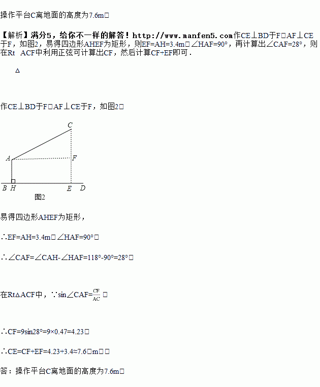图1是一辆吊车的实物图,图2是其工作示意图,AC是可以伸缩的起重臂,其转动点A离地面BD的高度AH为3.4m.当起重臂AC长度为9m,张角∠HAC为118°时,求操作平台C离地面的高度(结果保留小数点后一位:参考数据:sin28°≈0.47,cos28°≈0.88,tan28°≈0.53)