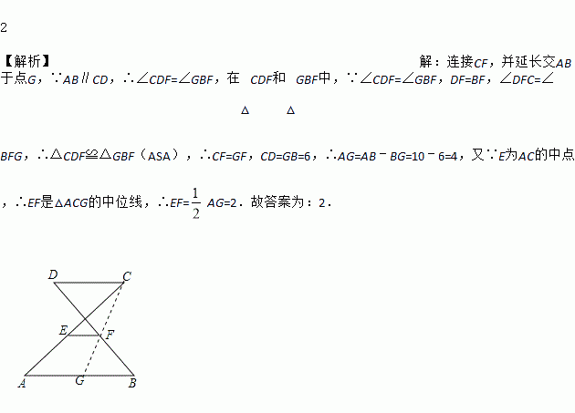 如图,已知AB∥CD,E,F分别为AC,BD的中点,若AB=10,CD=6,则EF的长是_______.