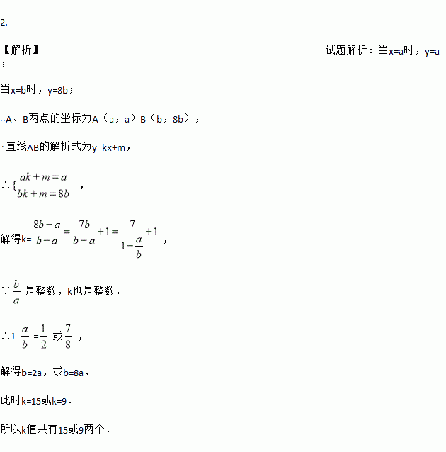 如图,点A,B分别在一次函数y=x,y=8x的图象上,其横坐标分别为a,b(a>0,b>0).设直线AB的解析式为y=kx+m,若是整数时,k也是整数,满足条件的k值共有 个.