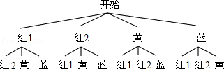 ∴一共有12种情况,两次摸到不同颜色球的有10种情况,* 红1 红2 黄 蓝 红1 * (红1,红2) (红1,黄) (红1,蓝) 红2 (红2,红1) * (红2,黄) (红2,蓝) 黄 (黄,红1) (黄,红2) * (黄,蓝) 蓝 (蓝,红1) (蓝,红2) (蓝,黄) *
