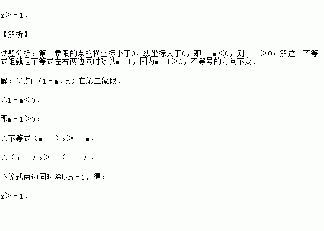 x>﹣1. 【解析】 试题分析:第二象限的点的横坐标小于0,纵坐标大于0,即1﹣m<0,则m﹣1>0;解这个不等式组就是不等式左右两边同时除以m﹣1,因为m﹣1>0,不等号的方向不变. 【解析】 ∵点P(1﹣m,m)在第二象限, ∴1﹣m<0, 即m﹣1>0; ∴不等式(m﹣1)x>1﹣m, ∴(m﹣1)x>﹣(m﹣1), 不等式两边同时除以m﹣1...