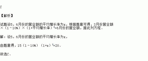 (2015秋•保定期末)某商店3月份的营业额为15万元,4月份的营业额比3月份的营业额减少了10%,商店经过加强管理,实施各种措施.使得5,6月份的营业额连续增长,6月份的营业额达到了20万元;设5,6月份的营业额的平均增长率为x,以题意可列方程为( )