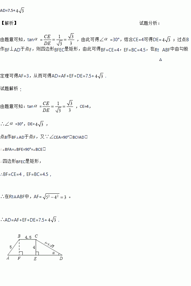 如图,一段河坝的断面为梯形ABCD,试根据图中数据,求出坡角和坝底宽AD.(结果保留根号)