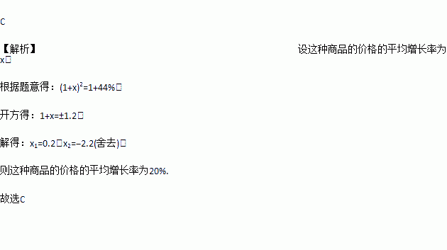 某种商品经过连续两次涨价后的价格比原来上涨了44%,则这种商品的价格的平均增长率是( )