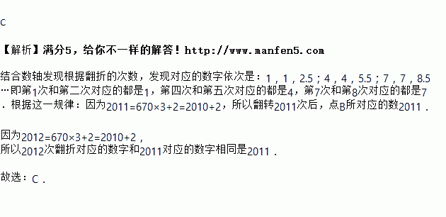等边△ABC在数轴上的位置如图所示,点A、C对应的数分别为0和-1,若△ABC绕顶点沿顺时针方向在数轴上连续翻转,翻转1次后,点B所对应的数为1,则连续翻转2012次后,点B( )