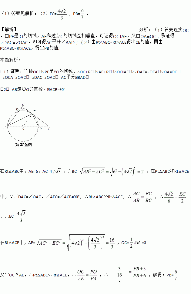 如图,AB是⊙O的直径,点C为⊙O上一点,AE和过点C的切线互相垂直,垂足为E,AE交⊙O于点D,直线EC交AB的延长线于点P,连接AC,BC.