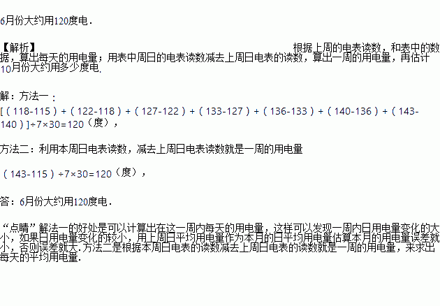 某个家庭为了估计自己家6月份的用电量,对月初的一周电表的读数进行了记载,上周日电表的读数是115度.以后每日的读数如下表: