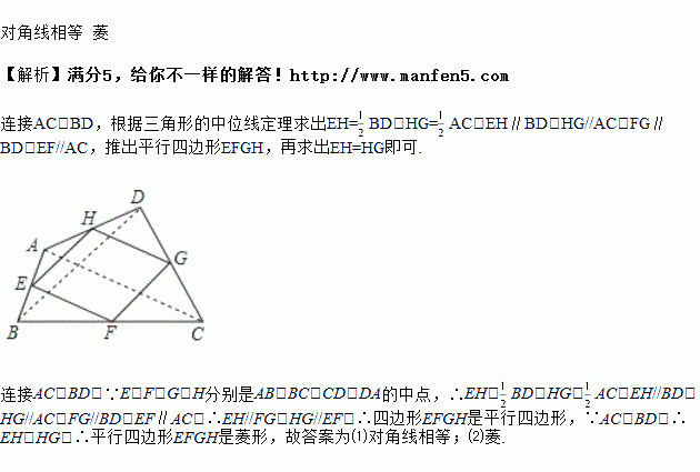 如图所示,在四边形中,、、、分别是、、、的中点,请添加一个与四边形对角线有关的条件________,使四边形是特殊的平行四边形为________形.