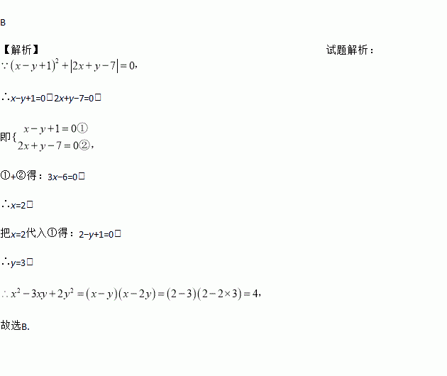 已知(x﹣y+1)2+|2x+y﹣7|=0.则x2﹣3xy+2y2的值为( )