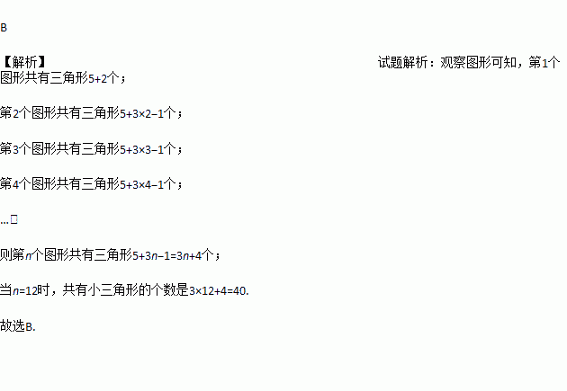 用大小相同的小三角形摆成如图所示的图案,按照这样的规律摆放,则第12个图案中共有小三角形的个数是( )