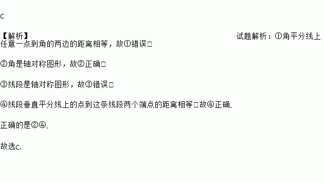 ②角是轴对称图形;③线段不是轴对称图形;④线段垂直平分线上的点到这条线段两个端点的距离相等