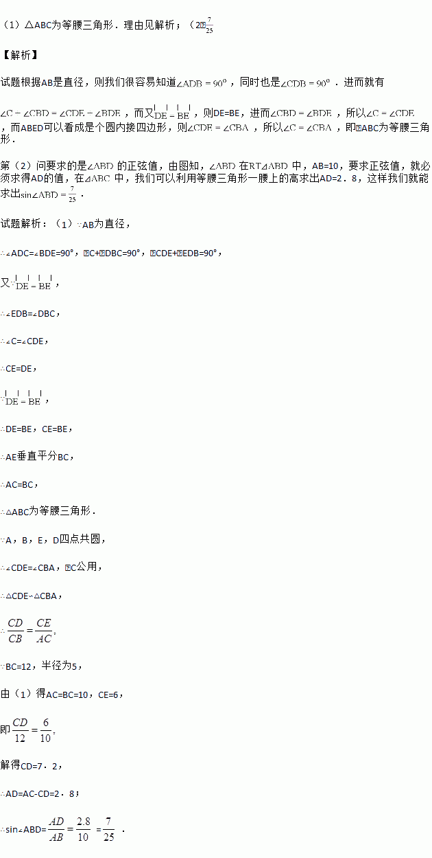 (2)已知半圆的半径为5,BC=12,求sin∠ABD的值.