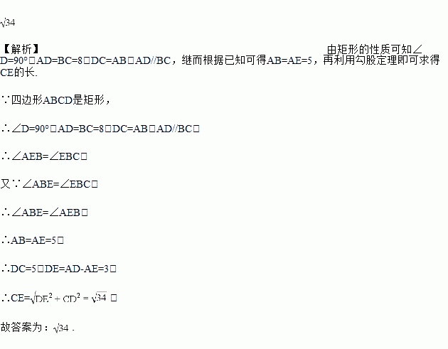 如图,在矩形ABCD中,∠ABC的平分线交AD于点E,连接CE.若BC=8,AE=5,则CE=______.
