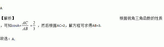在Rt△ABC中,∠C=90°,如果AC=2,cosA=,那么AB的长是( )