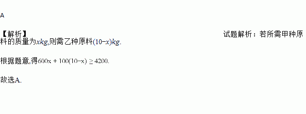 用甲、乙两种原料配制成某种饮料,已知这两种原料的维生素C含量及购买这两种原料的价格如下表:,甲种原料,乙种原料维生素C含量(单位/千克),600,100原料价格(元/千克),8,4现配制这种饮料10千克,要求至少含有4200单位的维生素C.若所需甲种原料的质量为x千克,则x应满足的不等式为( )