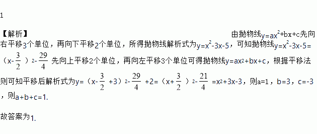 把抛物线先向右平移3个单位,再向下平移2个单位,所得抛物线解析式为,则a+b+c=___________。