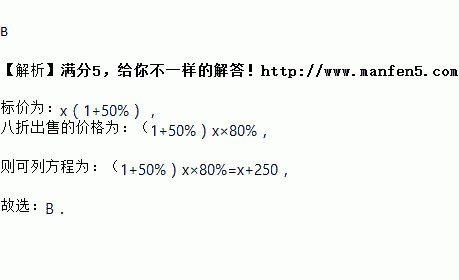 C. (1+50%x) 80%=x-250 D. (1+50%x) ![]()