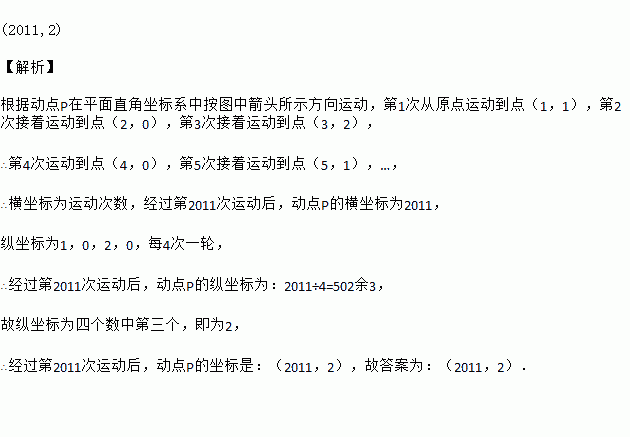 如图,动点P在平面直角坐标系中按图中箭头所示方向运动,第1次从原点运动到点(1,1),第2次接着运动到点(2,0),第3次接着运动到点(3,2),…,按这样的运动规律,经过第2011次运动后,动点P的坐标是________