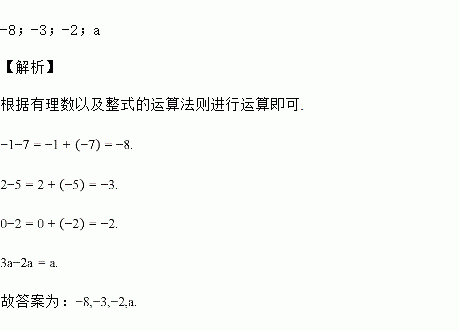 计算:-1-7=__________ ,2-5= _______ ,0-2=_______ ,3a-2a=_______