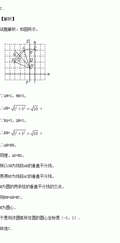 如图,一圆弧过方格的格点A、B、C,试在方格中建立平面直角坐标系,使点A的坐标为(-2,4),则该圆弧所在圆的圆心坐标是( )