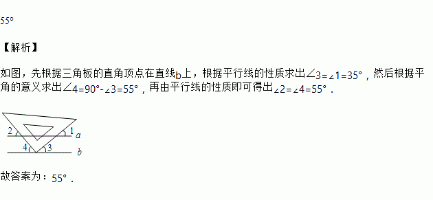 如图,已知a // b,小亮把三角板的直角顶点放在直线b上.若∠1=35°,则∠2的度数为________.