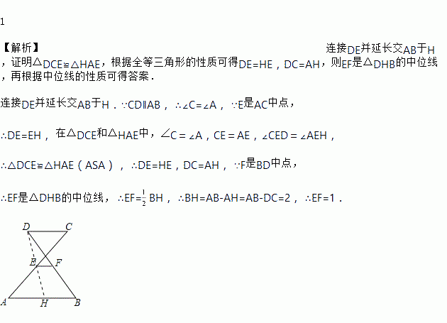 如图,AB∥CD,E、F分别是AC、BD的中点,若AB=5,CD=3,则EF的长为______________.