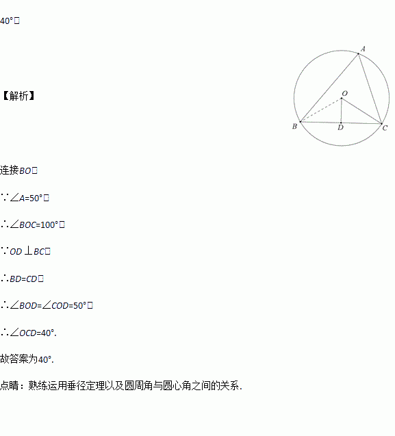 如图,△ABC内接于⊙O,OD⊥BC于D,∠A=50°,则∠OCD的度数是_____°.