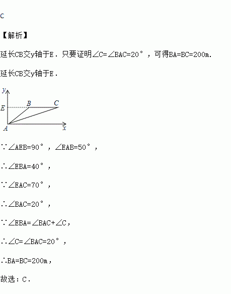 (题文)如图,甲、乙二人同时从A地出发,甲沿北偏东50°方向行走200m后到达B地,并立即向正东方向走去,乙沿北偏东70°方向行走,二人恰好在C地相遇,则B、C两地的距离为( )