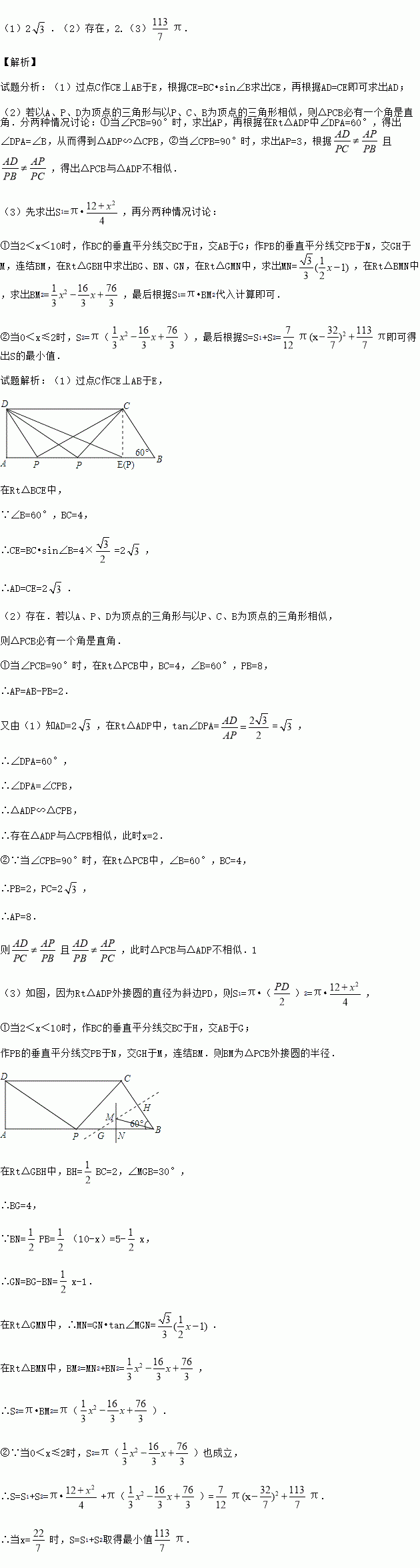 (3)设△ADP与△PCB的外接圆的面积分别为S1、S2,若S=S1+S2,求S的最小值.