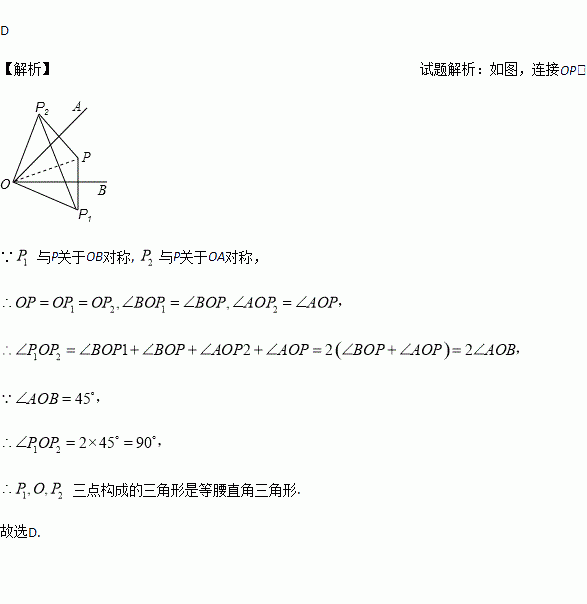 已知∠AOB=45°,点P在∠AOB内部,P1与P关于OB对称,P2与P关于OA对称,则P1,O,P2三点构成的三角形是( )