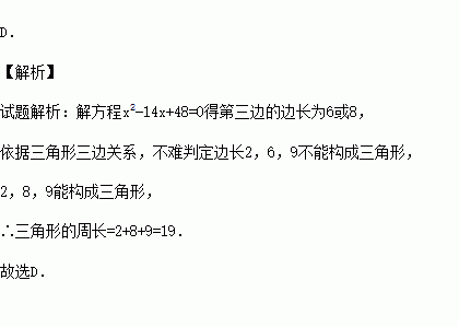 已知三角形两边长分别为2和9,第三边的长为二次方程x2-14x+48=0的一根, 则这个三角形的周长为( )