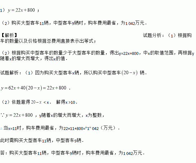 某汽车运输公司根据实际需要计划购买大、中型两种客车共20辆,已知大型客车每辆62万元,中型客车每辆40万元,设购买大型客车x(辆),购车总费用为y(万元).