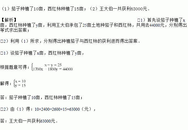 王大伯承包了25亩土地,今年春季改种茄子和西红柿两种大棚蔬菜,用去了44000元.其中种茄子每亩用了1700元,获纯利2400元;种西红柿每亩用了1800元,获纯利2600元.