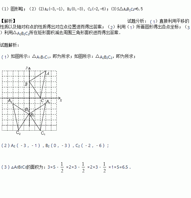 (1)在如图所示的直角坐标系中,有一个三角形△ABC。把△ABC向下平移6个单位,得到△A1B1C1