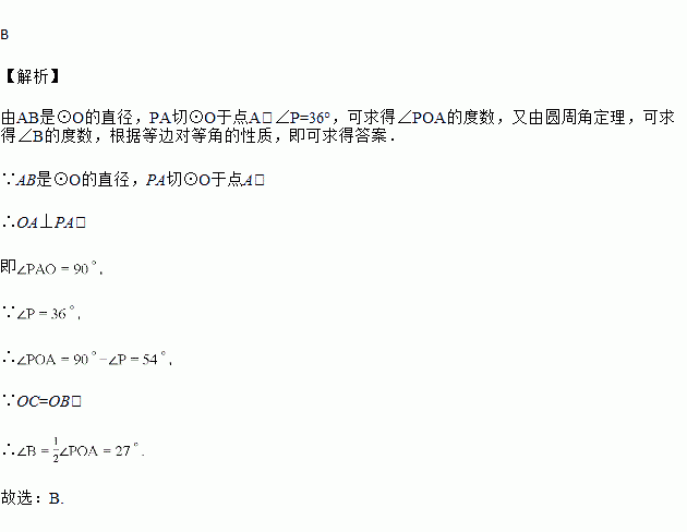 如图,AB是⊙O的直径,点P是⊙O外一点,PO交⊙O于点C,连接BC、PA.若∠P=36°,PA与⊙O相切,则∠B等于( )