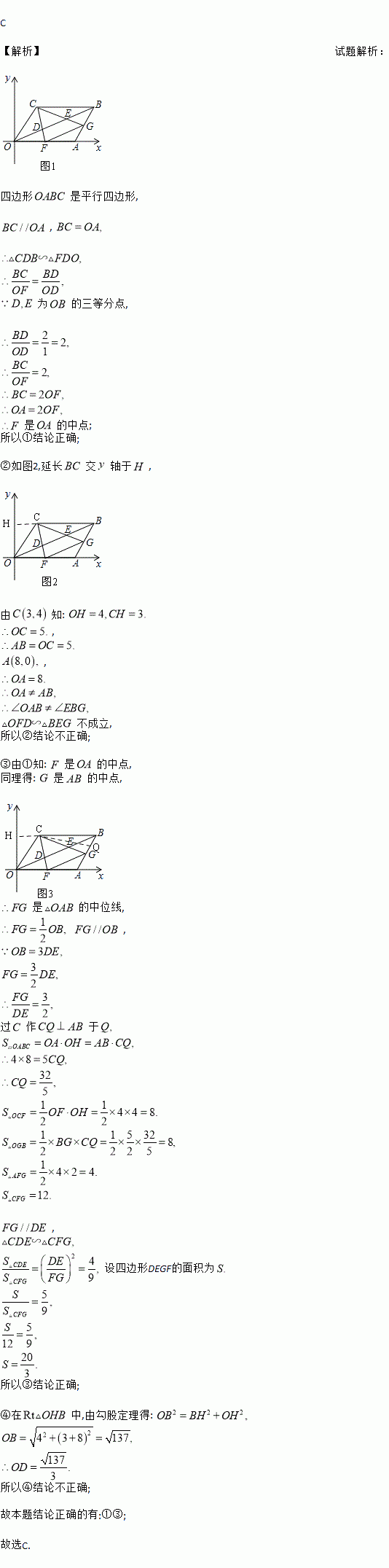 如图,平面直角坐标系中O是原点,平行四边形ABCO的顶点A、C的坐标分别(8,0)、(3,4),点D,E把线段OB三等分,延长CD、CE分别交OA、AB于点F,G,连接FG.则下列结论:①F是OA的中点;②△OFD与△BEG相似;③四边形DEGF的面积是