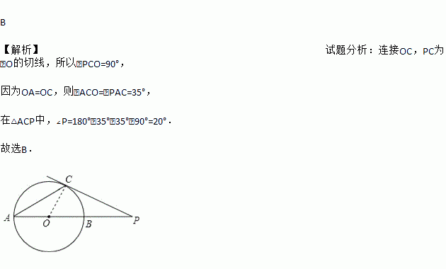 已知⊙O的直径AB与弦AC的夹角为35°,过C点的切线PC与AB的延长线交于点P,则∠P等于( )