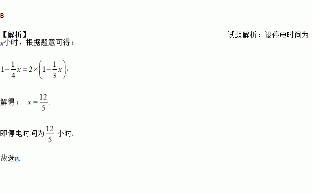 有两支同样长的蜡烛,一支能点燃4小时,另一支能点燃3小时,一次遇到停电,同时点燃这两支蜡烛,来电后同时吹灭,发现其中的一支是另一支的一半,停电时间为( )小时