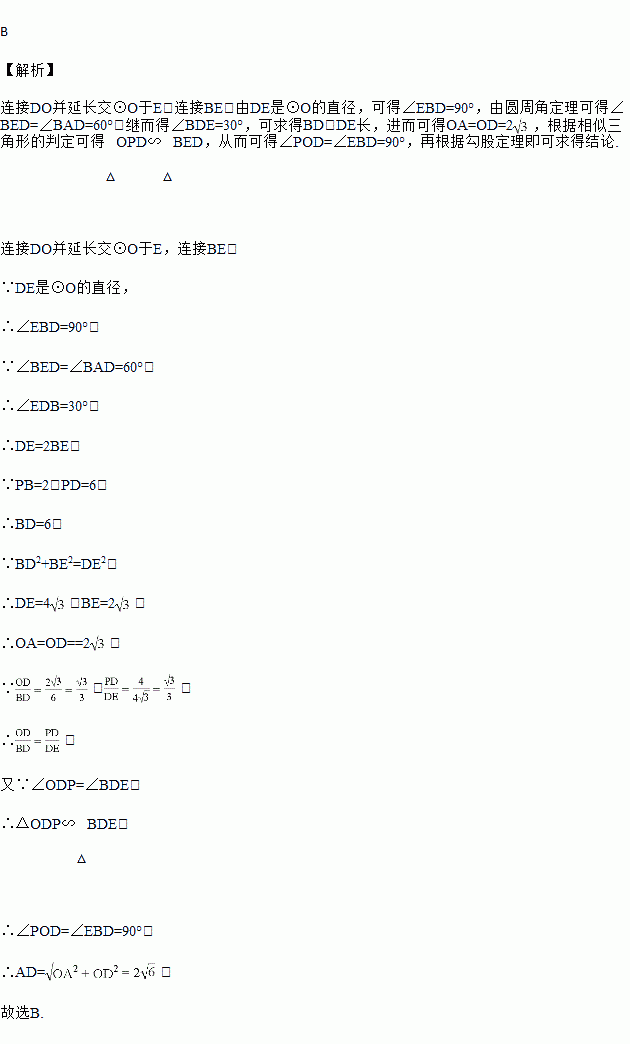 如图,△ABD内接于圆O,∠BAD=60°,AC为圆O的直径.AC交BD于P点且PB=2,PD=4,则AD的长为( )