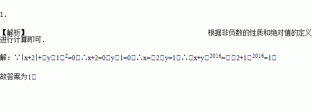 已知|x+2|+(y﹣1)2=0,则(x+y)2016=_______.