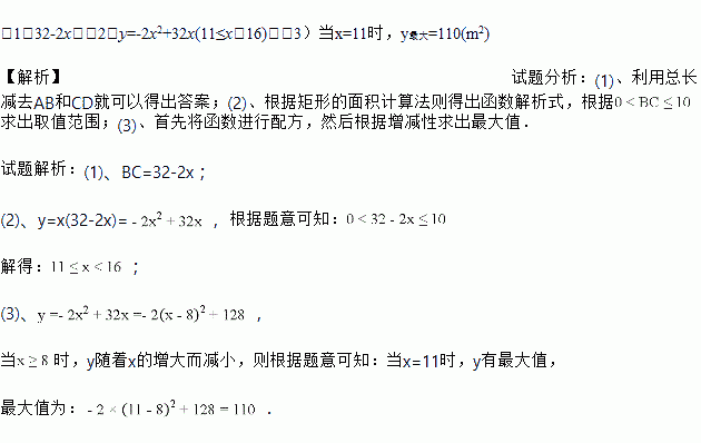 为了美化生活环境,小兰的爸爸要在院墙外的一块空地上修建一个矩形花圃.如图所示,矩形花圃的一边利用长10米的院墙,另外三条边用篱笆围成,篱笆的总长为32米.设AB的长为x米,矩形花圃的面积为y平方米.
