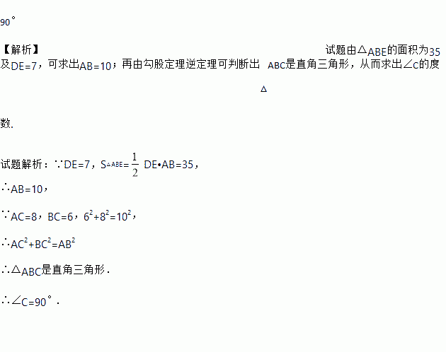 如图所示,在△中,AC=8,BC=6;在△中,DE是AB边上的高,DE=7.△ABE的面积是35,求∠C的度数.
