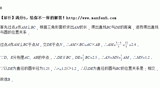 如图,△ABC中,AB=3,AC=4,BC=5,D、E分别是AC、AB的中点,则以DE为直径的圆与BC的位置关系是( )