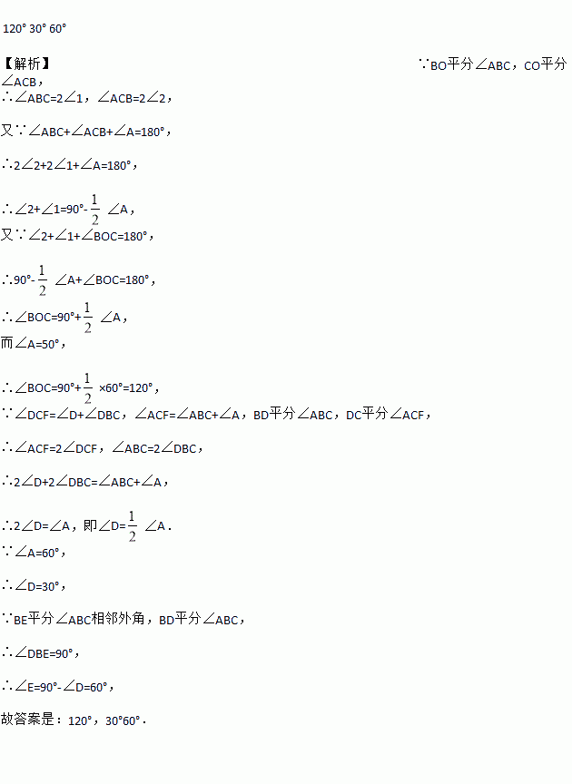 如图所示,∠ABC,∠ACB的内角平分线交于点O,∠ABC 的内角平分线与∠ACB的外角平分线交于点D,∠ABC与∠ACB的相邻外角平分线交于点E,且∠A=60°, 则∠BOC=_______,∠D=_____,∠E=________.