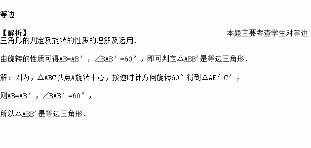 如图,△ABC以点A为旋转中心,按逆时针方向旋转60°,得△AB′C′,则△ABB′是 三角形.