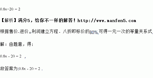 某书店把一本新书按标价的八折出售,仍获利2元,若该书进价为20元,设标价为x元,则可列一元一次方程为________.