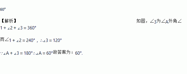 如图所示,△ABC的外角∠1+∠2=240°,那么∠A=______.